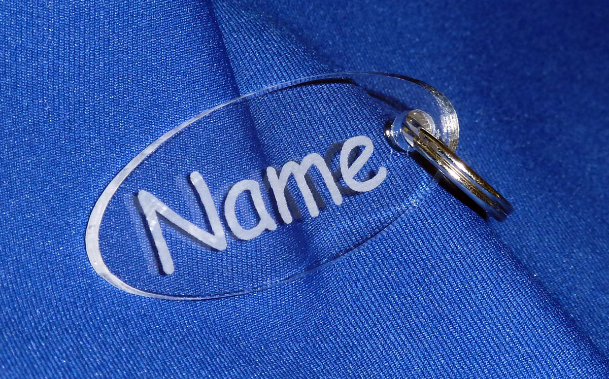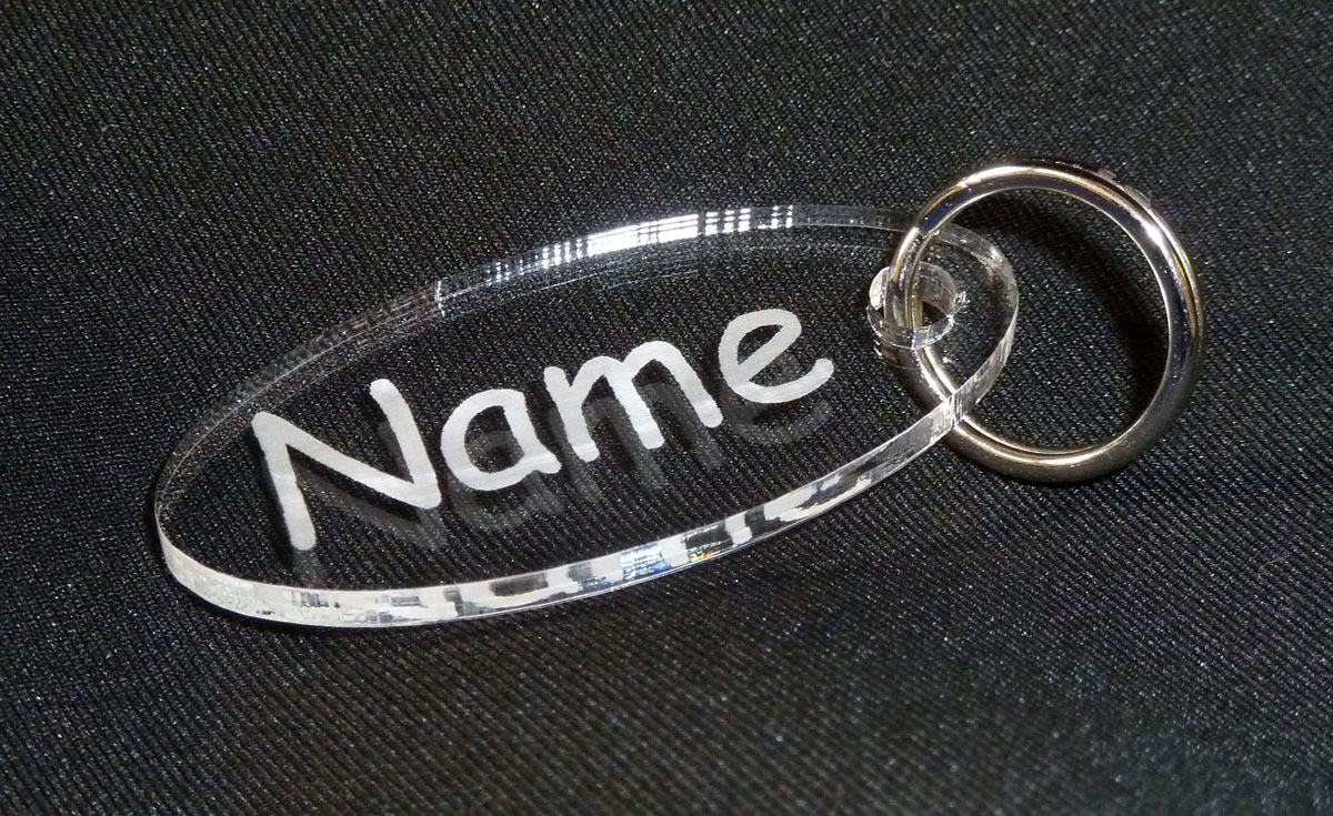 Der Schlüsselanhänger besteht aus Acrylglas und die Gravur wird mit einem CO2-Laser "eingebrannt". Bei der Gravur werden tausende Punkte in das Material gelasert. Dadurch verfärbt es sich weiß. Die Gravur ist dadurch dauerhaft und lässt sich nicht einfach "wegwischen".