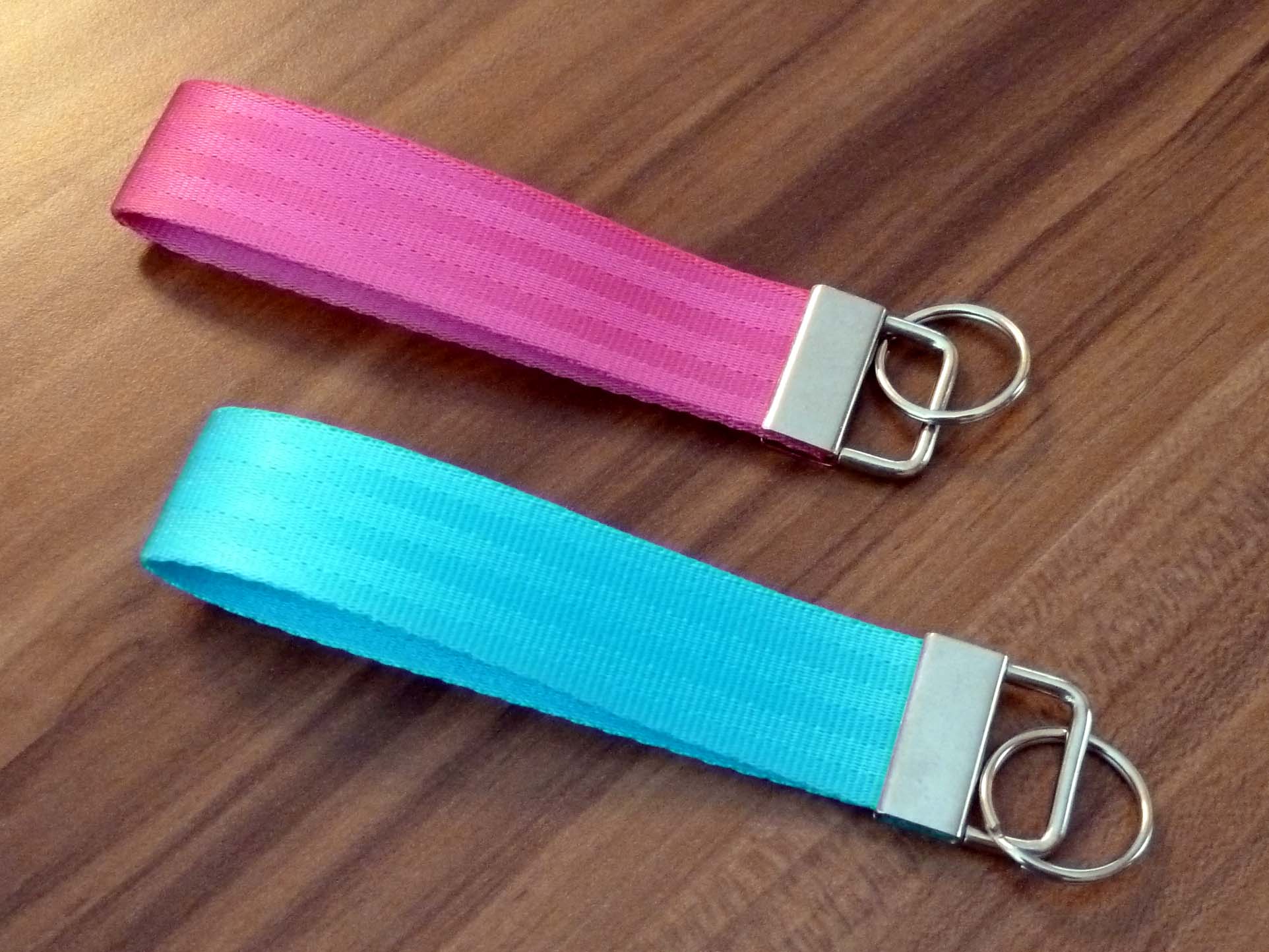 Der Schlüsselanhänger bestehen aus Sicherheitsgurtband und die Gravur wird mit einem Laser eingebrannt.
